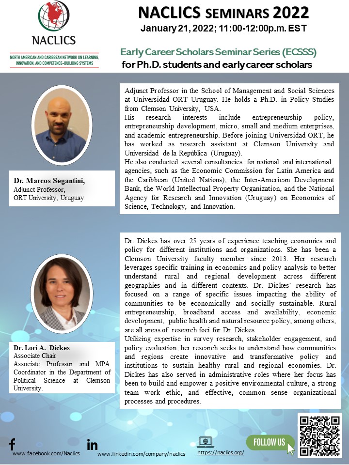 Ph. D. Marcos Segantini (ORT University, Uruguay) and Ph.D. Lori Dickes (Clemson University, SC, USA) will be presenting their work on A tale of the two Carolinas: how similar states are faring in the knowledge economy.