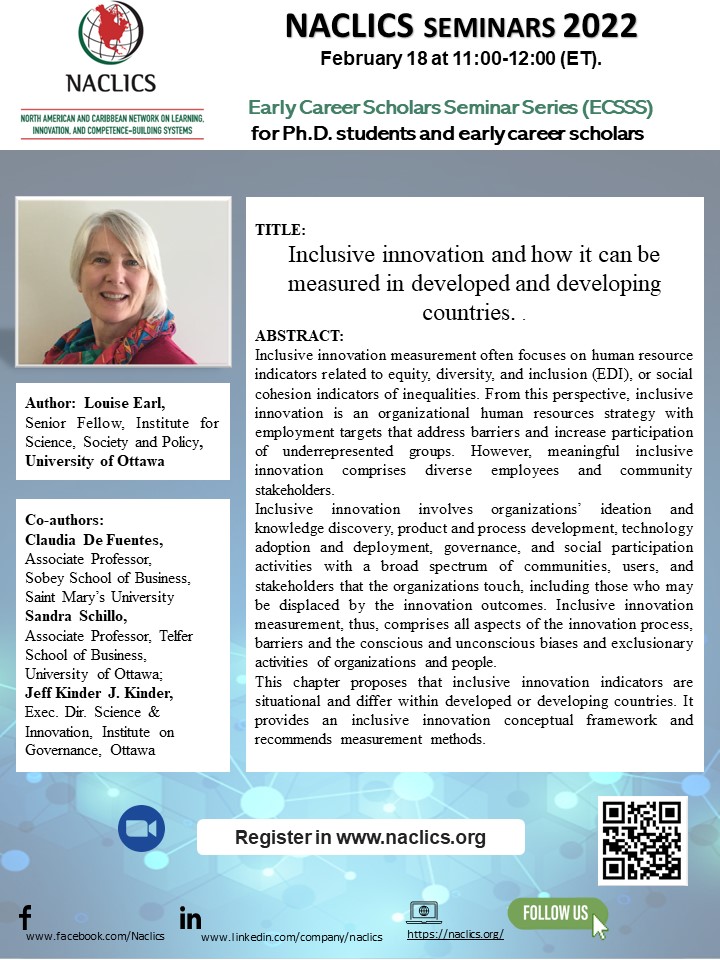 Our next event for the Early Career Scholar Seminar Series (ECSSS) will be on Friday, February 18 at 11:00-12:00 (ET). Louise Earl will be presenting her work on Inclusive innovation and how it can be measured in developed and developing countries.