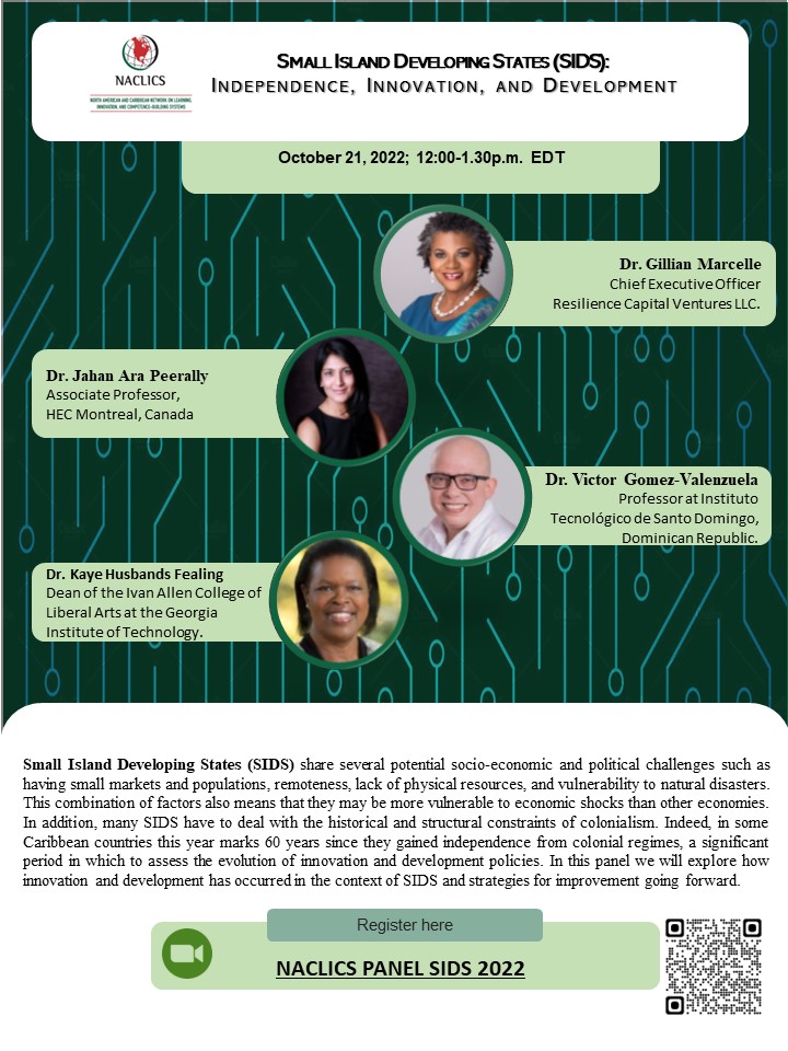 Small Island Developing States (SIDS) share several potential socio-economic and political challenges, such as having small markets and populations, remoteness, lack of physical resources, and vulnerability to natural disasters. This combination of factors also means that they may be more vulnerable to economic shocks than other economies. In addition, many SIDS have to deal with colonialism’s historical and structural constraints. Indeed, in some Caribbean countries, this year marks 60 years since they gained independence from colonial regimes, a significant period to assess the evolution of innovation and development policies. In this panel, we will explore how innovation and development have occurred in the context of SIDS and strategies for improvement going forward.
